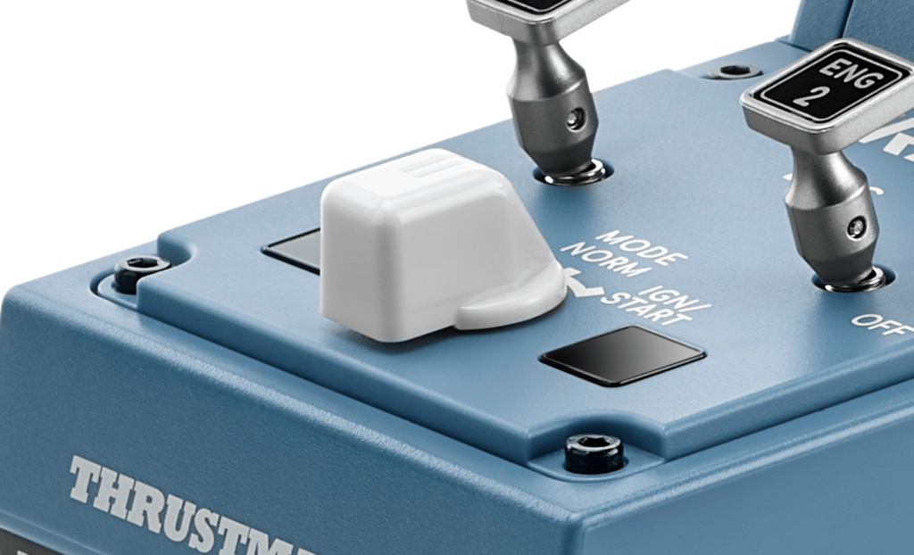 O quadrante de potência conta com 2 manetes independentes, botões adicionais e mecanismos de reversão de empuxo, permitindo controle realista das fases de voo.